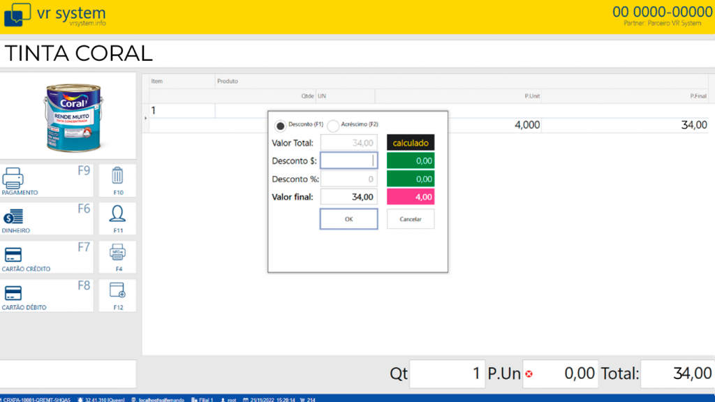 Tela de desconto/ acréscimo na venda, sendo a permissão/limite de desconto configurado por usuário, além do desconto na venda é possível dar desconto em apenas um produto.