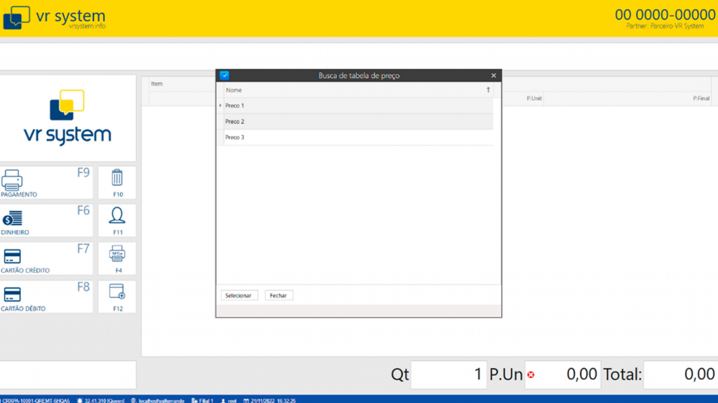 PDV com menu de funcionalidades que podem ser acionadas pelos atalhos de teclado ou pelo mouse navegando pelo MENU, além disso é possível pesquisar pela funcionalidade na tela de pesquisa do menu.