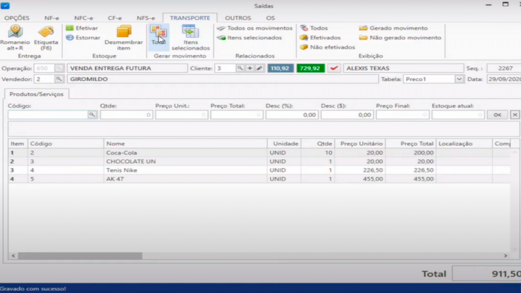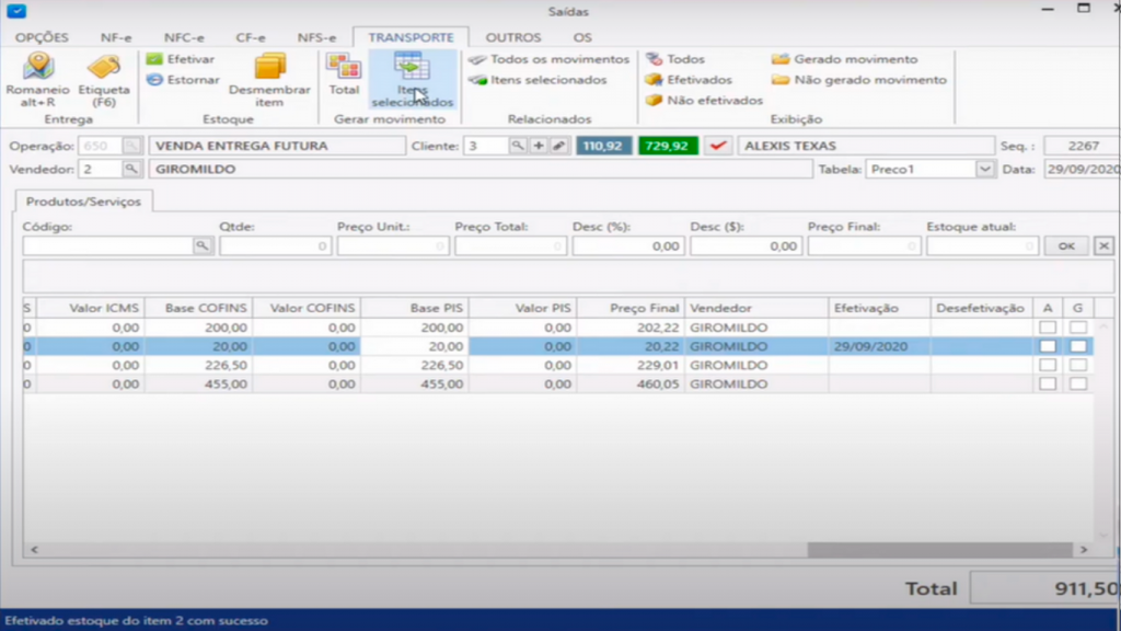 Após feita a baixa parcial, o produto selecionado para ser entrega é lançado em uma nova tela para que seja feita a movimentação de saída/entrega do mesmo.
