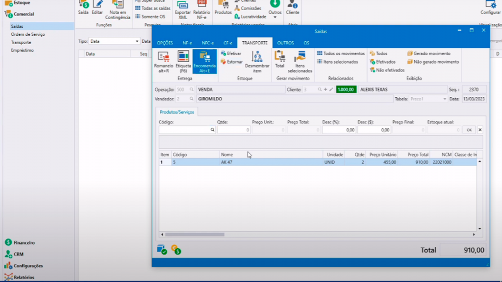 Após o movimento, podemos escolher o produto a ser dado baixa e iremos para uma nova operação de saída.