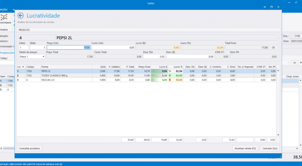 A análise de lucratividade é uma tela que pode ser exibida a partir da tela de saída, que apresenta um panorama geral dos produtos lançados no movimento, para que possa se observar o lucro em cada produto e no movimento total, na própria tela o usuário pode ir editando os valores tanto de custo como de venda que estão envolvidos no movimento.