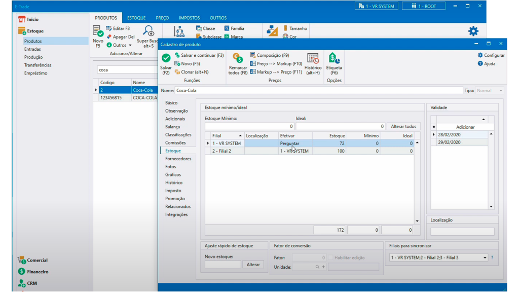 Na aba de cadastro de produto, é possível escolher na aba de estoque onde terá a coluna chamada de "efetivar" onde terá a escolha de onde ira efetivar a venda e será dada a baixa no estoque, seja na loja atual ou se será efetuada a baixa e entrega de outra filial. Assim como também é possível retirar parte dos produtos da loja atual e o restante da filial 1 ou 2.